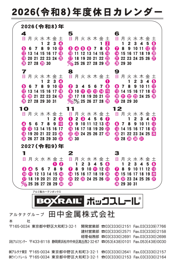 2026(令和8)年度休日カレンダー掲載 2026年3月3日 お知らせ 弊社の年間休日カレンダーを作成いたしました。 ご案内させていただきます。 長期休業(GW・お盆休み・年末年始)につきましては、 What’s Newsでもお知らせいたします。